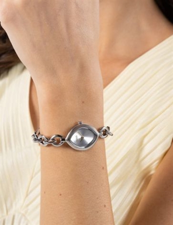 Diese Damenuhr überzeugt durch ihr filigranes Design und funkelnde Details.