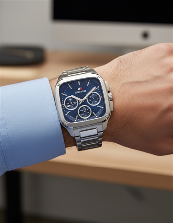 Die Tommy Hilfiger Herald Quartz Herrenuhr überzeugt durch ihr markantes blaues Zifferblatt mit drei präzisen Hilfszifferblättern, die zusätzliche Funktionen wie Stoppuhr und Kalender bieten. Das hochwertige Metallgliederarmband verleiht der Uhr eine edle Optik und sorgt für ausgezeichneten Tragekomfort bei gesellschaftlichen Anlässen.