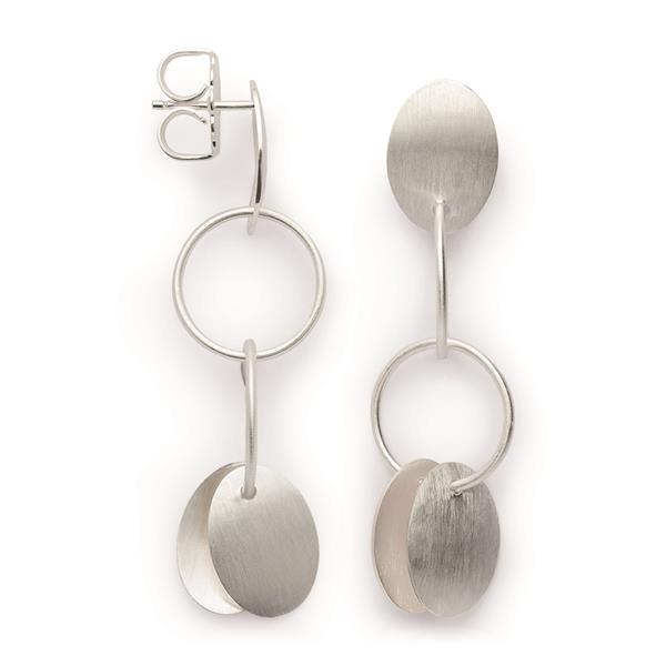 Paar Ohrringe mit mattem Finish, kreisförmige und ovale Elemente, Stecker oben sichtbar.