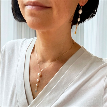 Das Y-Design ergänzt ausgeschnittene Abendgarderobe. Die 42 cm Länge passt zu verschiedenen Ausschnitten. Die Kombination aus Perlen und Topas verleiht den Outfits eine besondere Note.