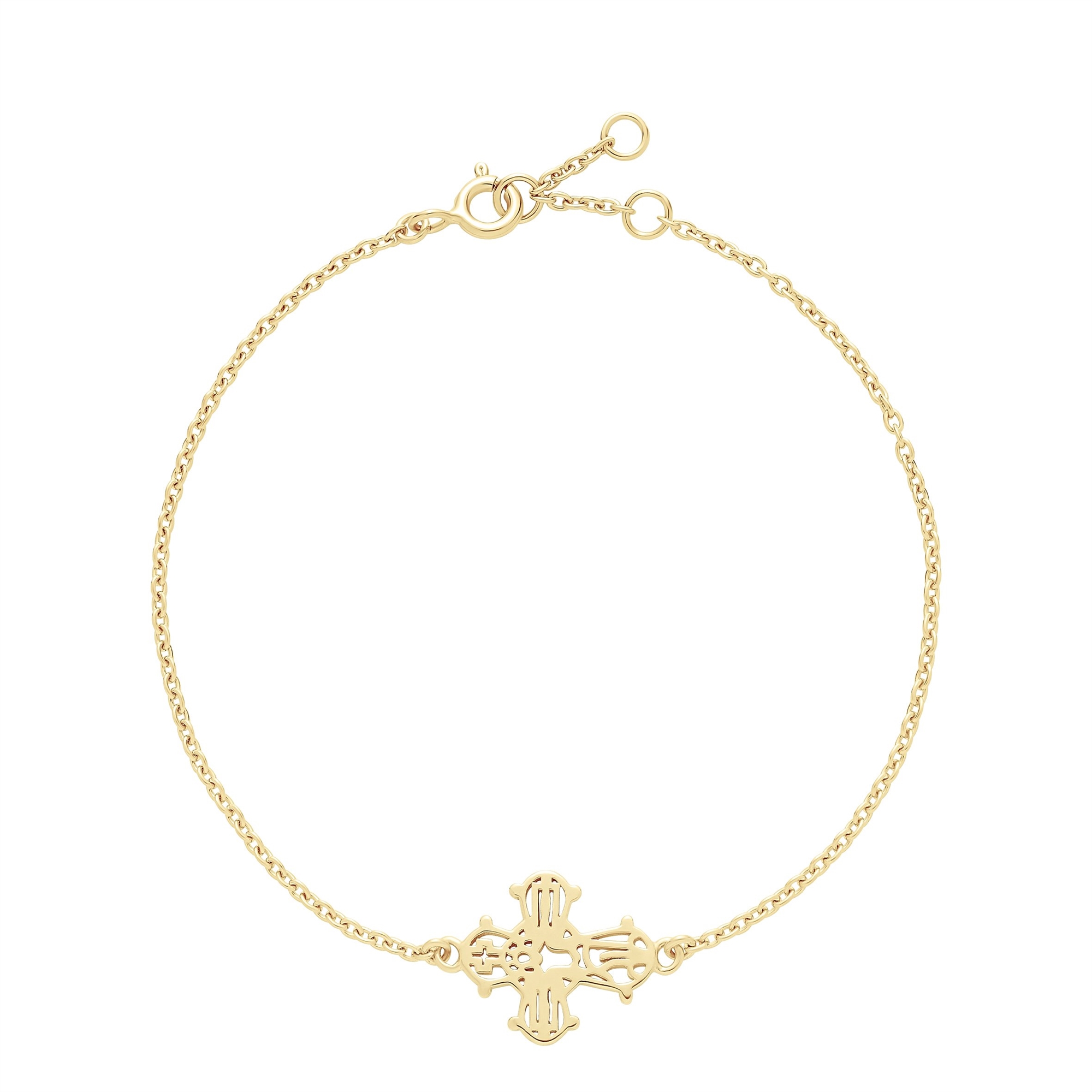Armband mit filigraner Kette und kreuzförmigem Anhänger in Gold, Verschluss oben sichtbar.