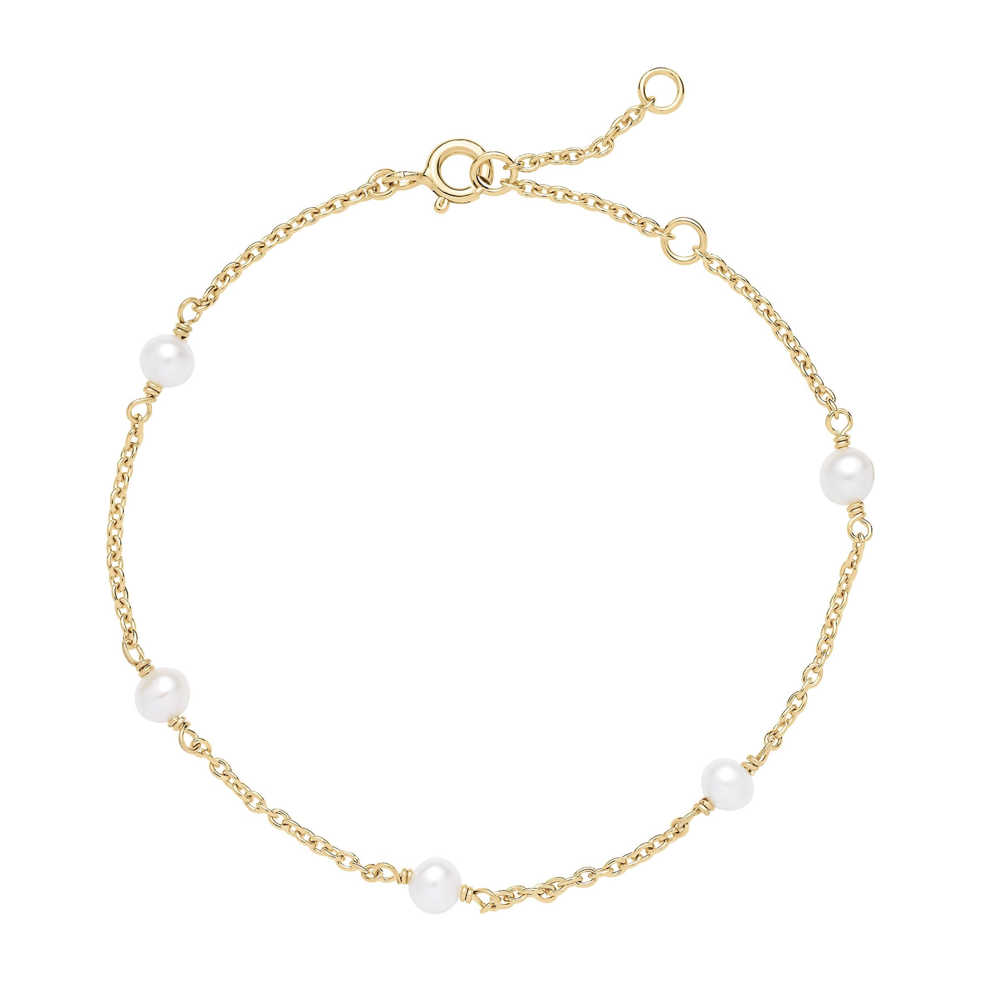 Armband mit fünf weißen Perlen auf einer feinen, goldfarbenen Kette mit kleinen Gliedern.