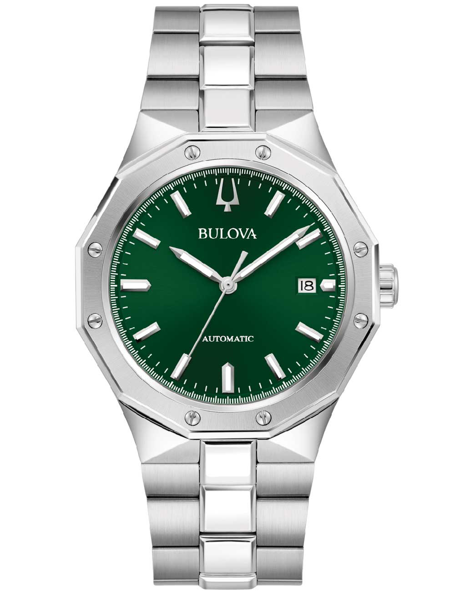 Das markante grüne Zifferblatt mit silbernen Indizes bietet eine ausgezeichnete Ablesbarkeit. Die achteckige Gehäuseform mit dekorativen Schrauben auf der Lünette setzt einen charakterstarken Akzent an Ihrem Handgelenk.