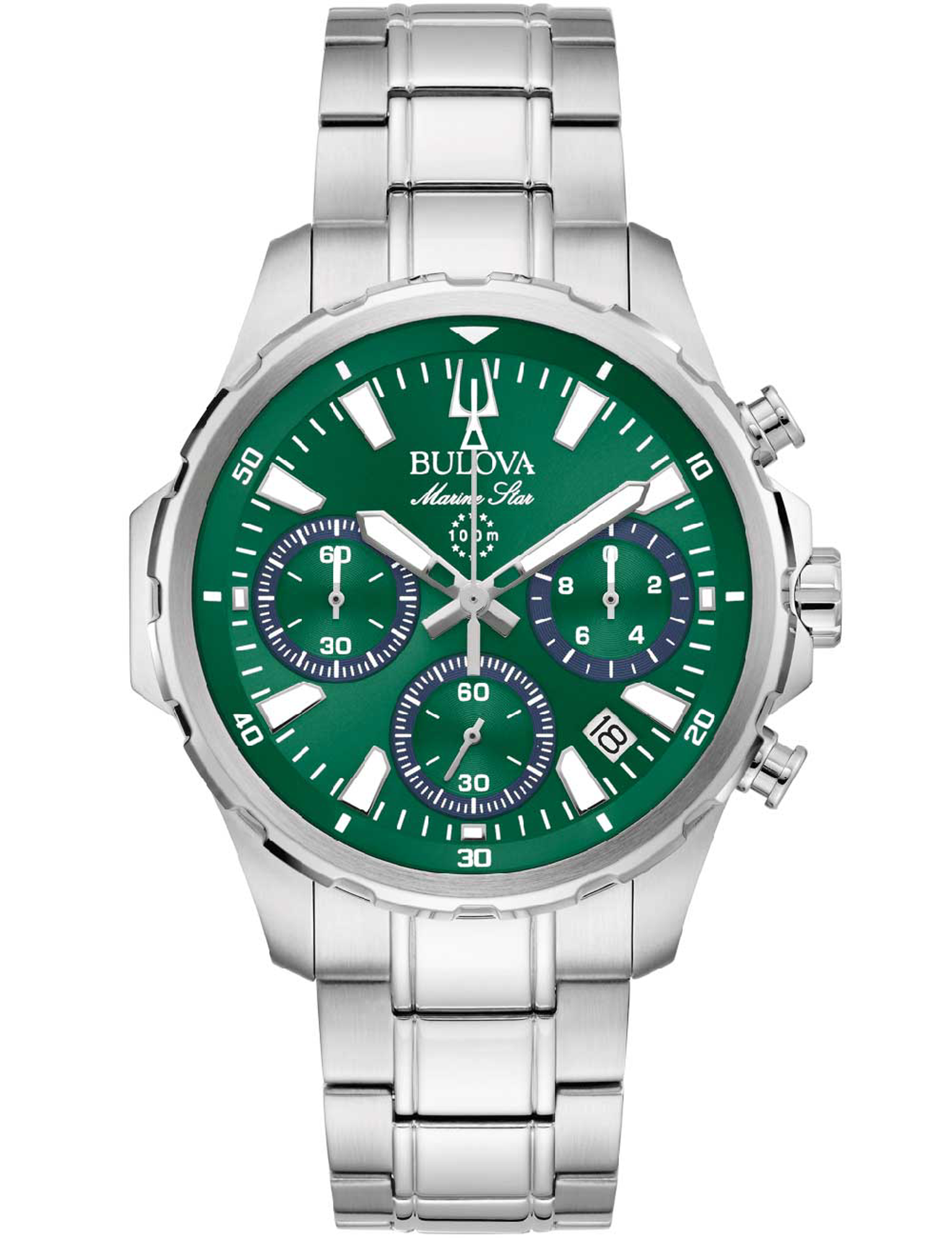 Diese Marine Star Uhr von Bulova vereint präzise Zeitmessung mit praktischer Funktionalität. Das markante grüne Zifferblatt mit drei Hilfszifferblättern bietet Ihnen zusätzliche Chronographenfunktionen für Ihre täglichen Aktivitäten.