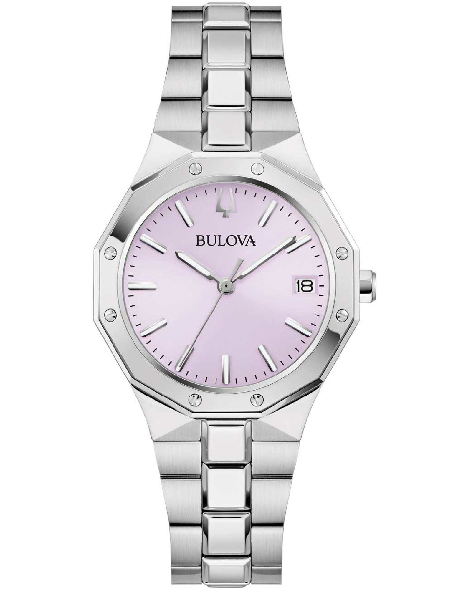 Runde Bulova-Uhr mit silbernem Armband, geometrischem Design und lila Zifferblatt, Datumsanzeige.