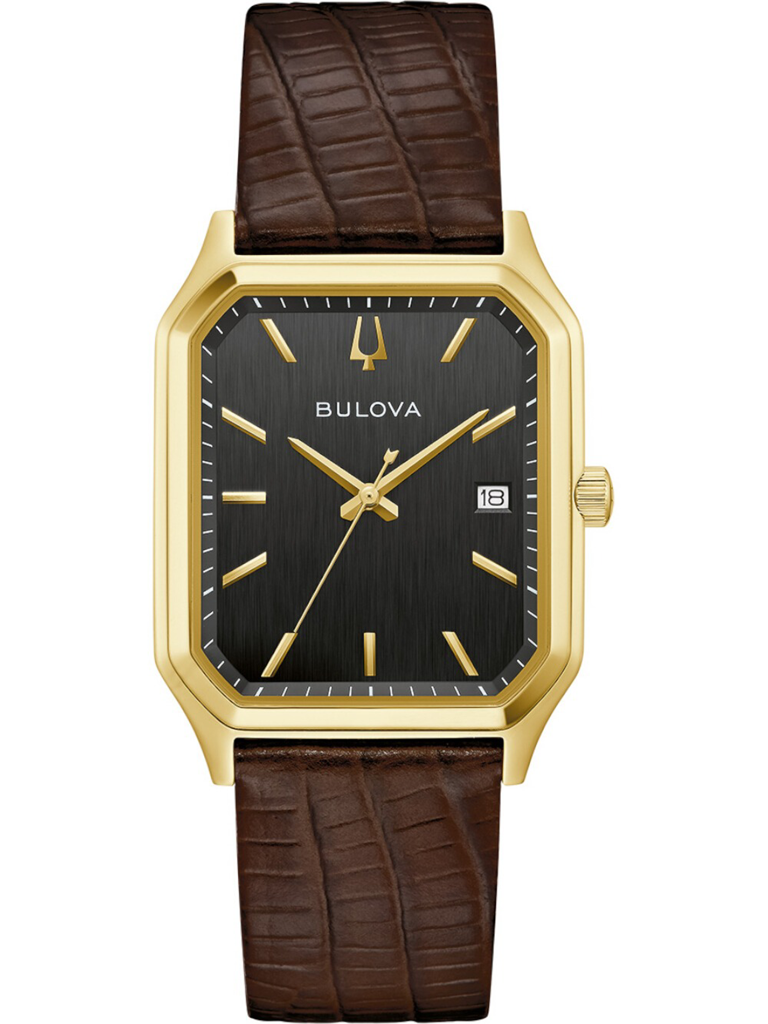 Das rechteckige Gehäuse mit schwarzem Zifferblatt macht diese 32 mm Bulova-Uhr zu einem vielseitigen Begleiter. Die goldfarbenen Markierungen und Zeiger sorgen für eine gute Ablesbarkeit bei Tag und Nacht.