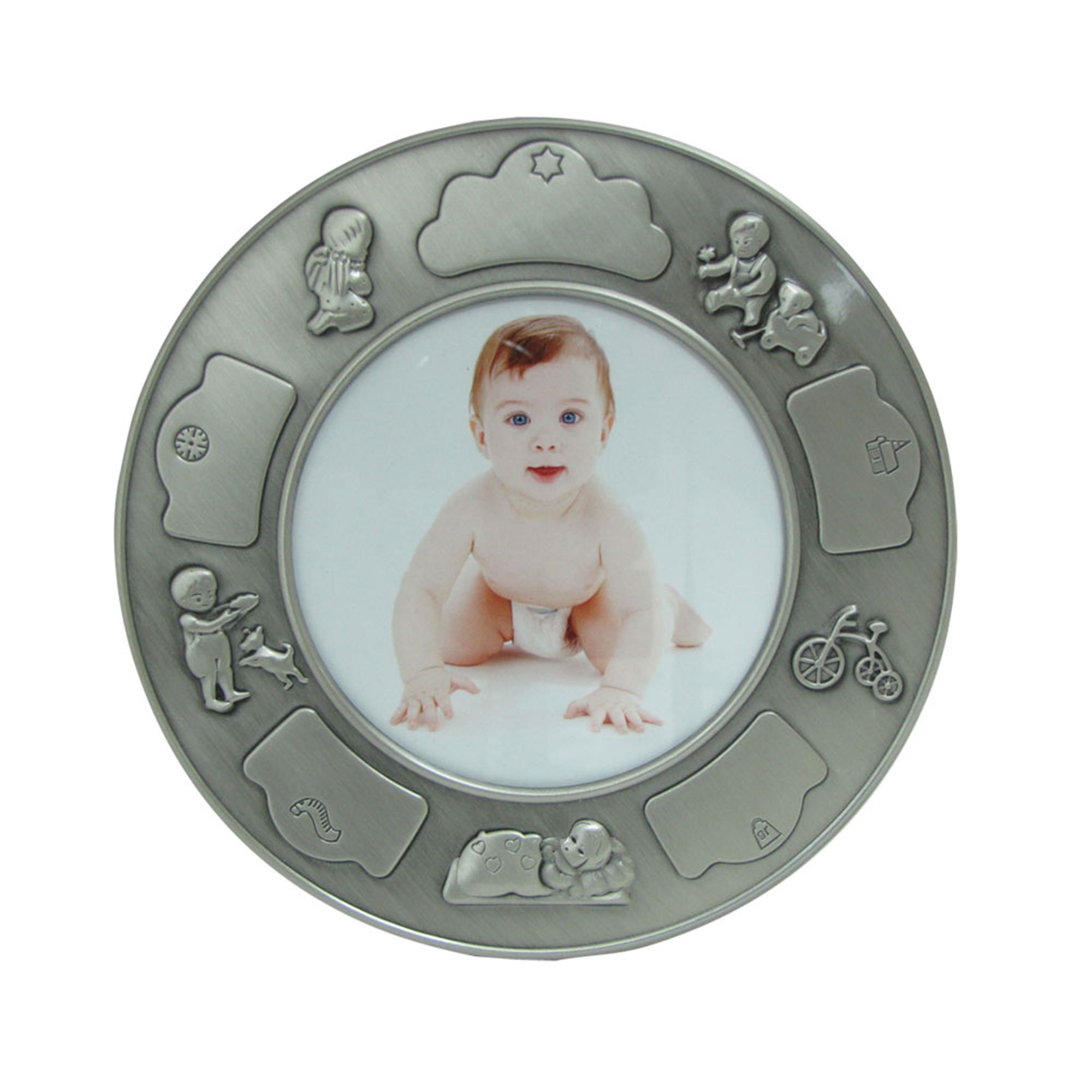 Fin fotoramme i fortinnet med motiver af små drenge. Rammen kan gives som en personlig dåbs- eller barselsgave. Rammen er en sød og kærlig måde hvorpå man kan bevare barnets fødselsdata. Rammens størrelse: 17 cm i diameter Billedstørrelse: 10