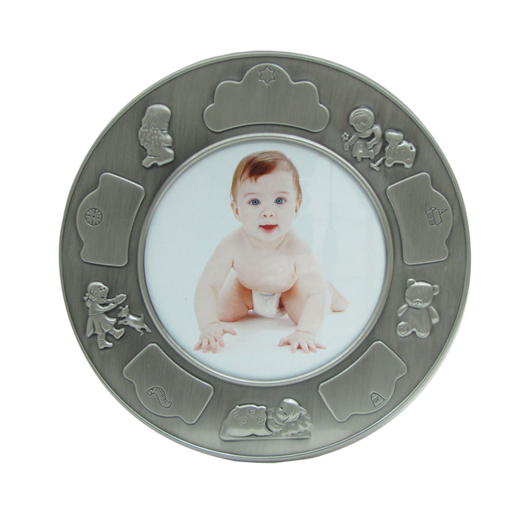 Fin fotoramme i fortinnet med motiver af legende piger, og en sød lille bamse. Rammen kan gives som en personlig dåbs- eller barselsgave og er en sød og kærlig måde hvorpå man kan bevare barnets fødselsdata. Rammens størrelse: 17 cm i diameter Materiale: Andet