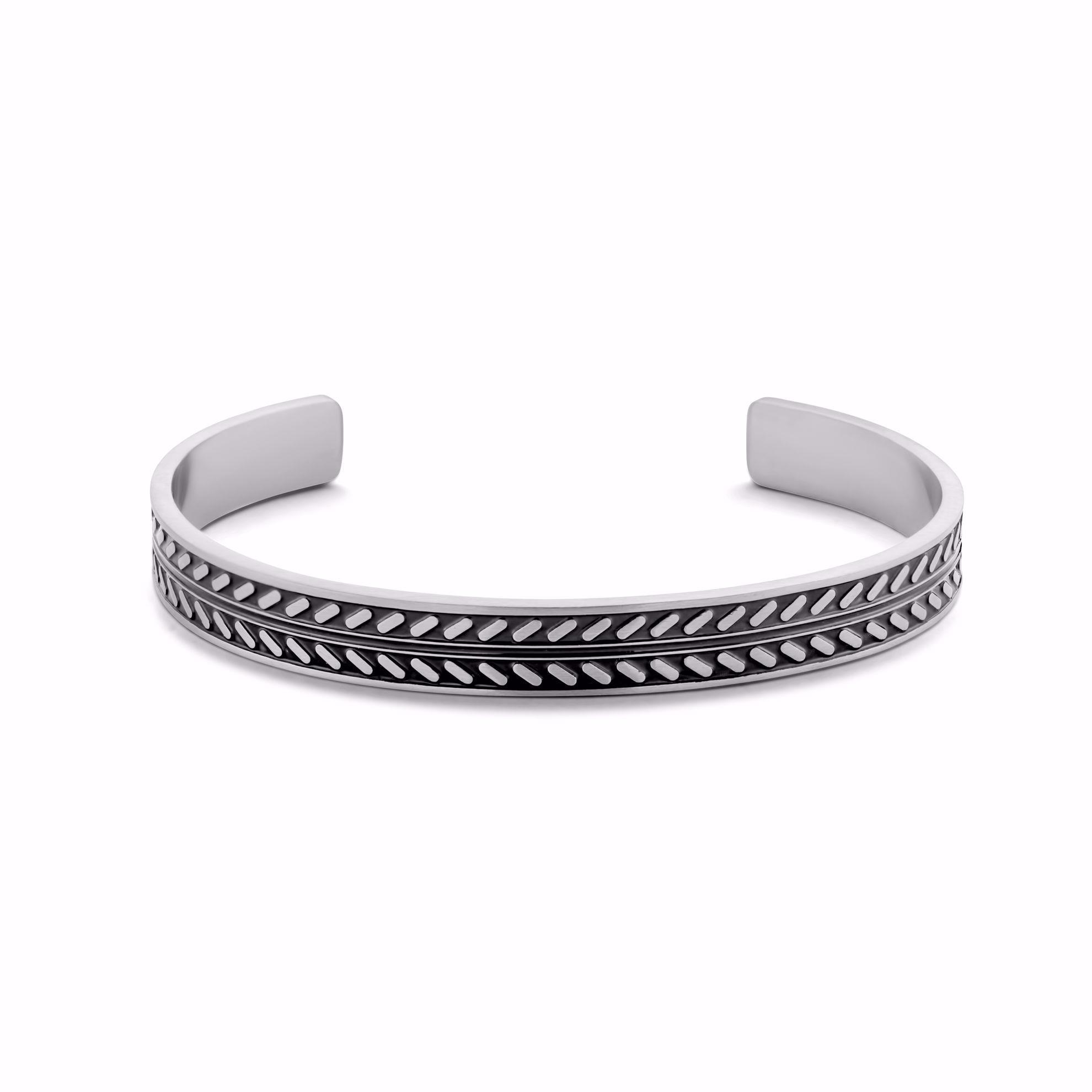Frank stählerner Armreif mit offenem Design und diagonalen Linien auf dunklem Hintergrund.