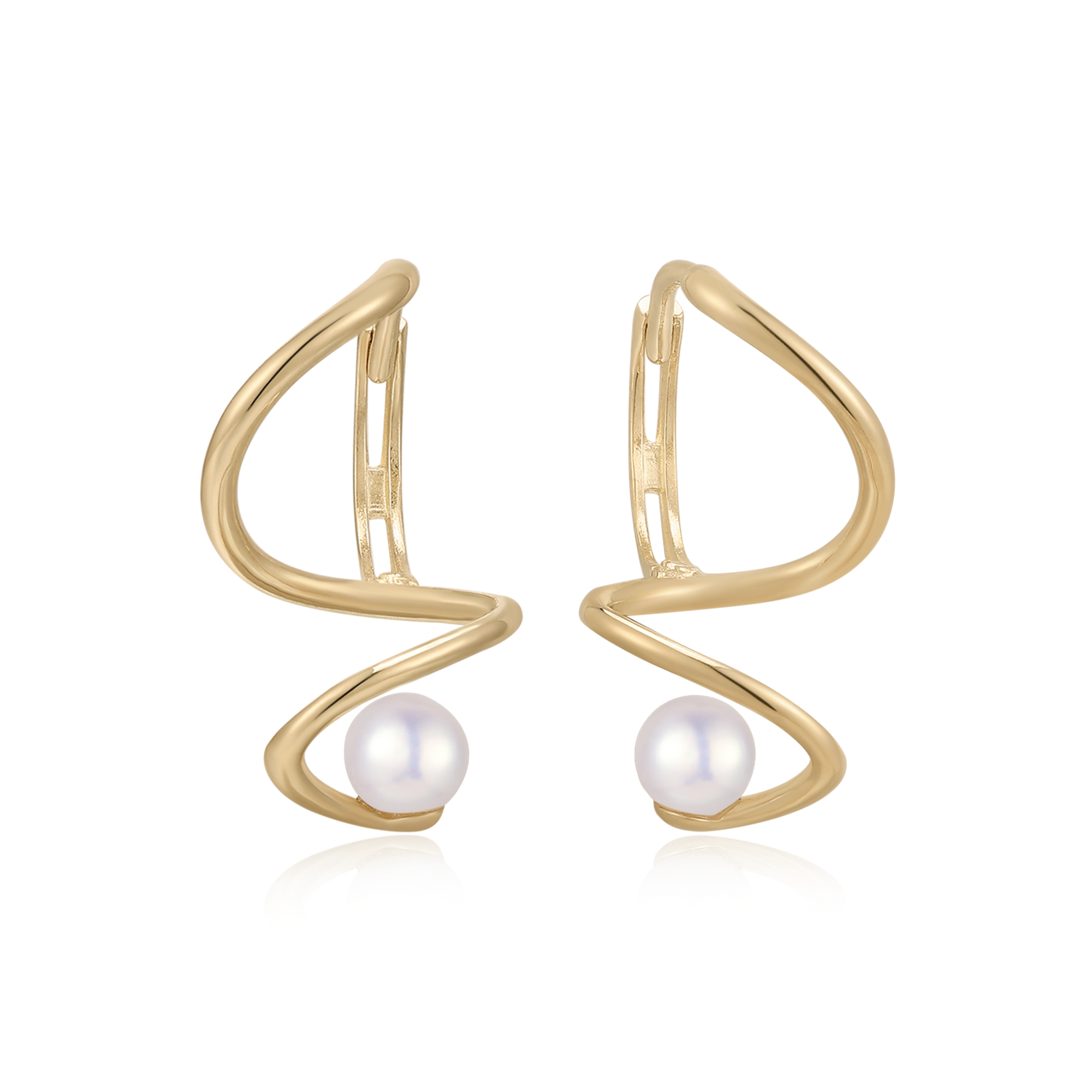 Goldene, spiralförmige Ohrringe mit einer Perle am Ende, von Støvring Design.