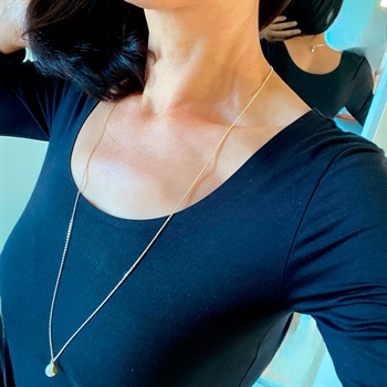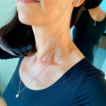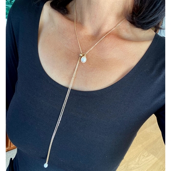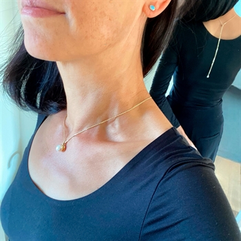Et smukt & kreativt kædedesign hvor længden justeres trinløst med Magic Bead/kuglen med silikonekerne.Kæden er 2 farvet i rhodineret/blank Anker Facet, samt ferskvandskulturperler foran og bagved.Kæden hænger smukt foran og samtidigt bag på ryggen, og kan vendes rundt og alt udført i Sterlingsølv.