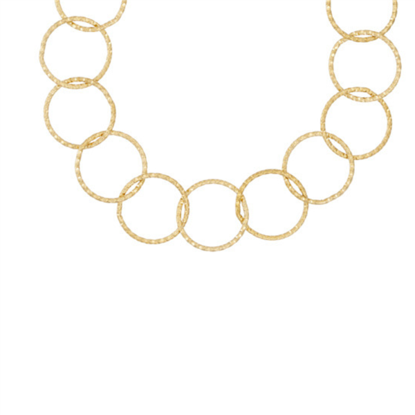 Smuk halskæde i stål, belagt med 14 karat guld, med rustikke ringe. Halskæden er 42 cm + 3 cm forlænger. Vandfast med unik holdbarhed.