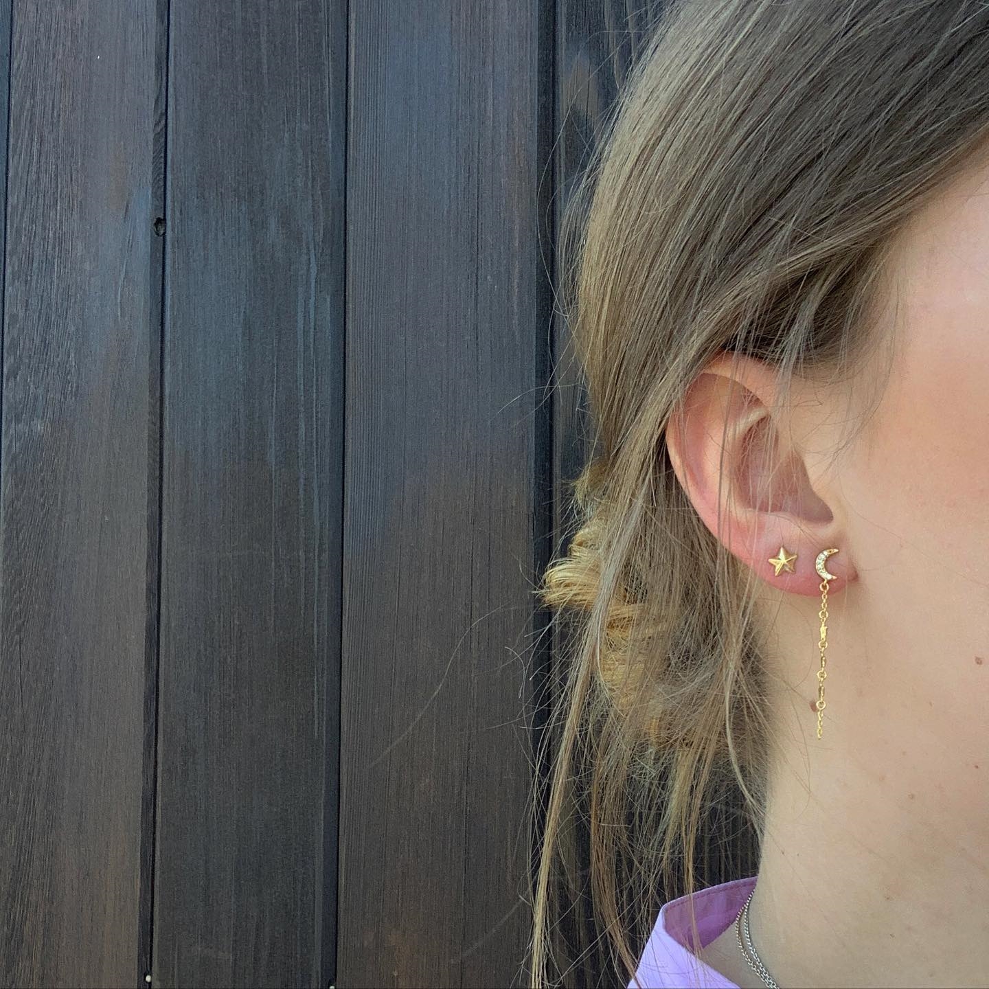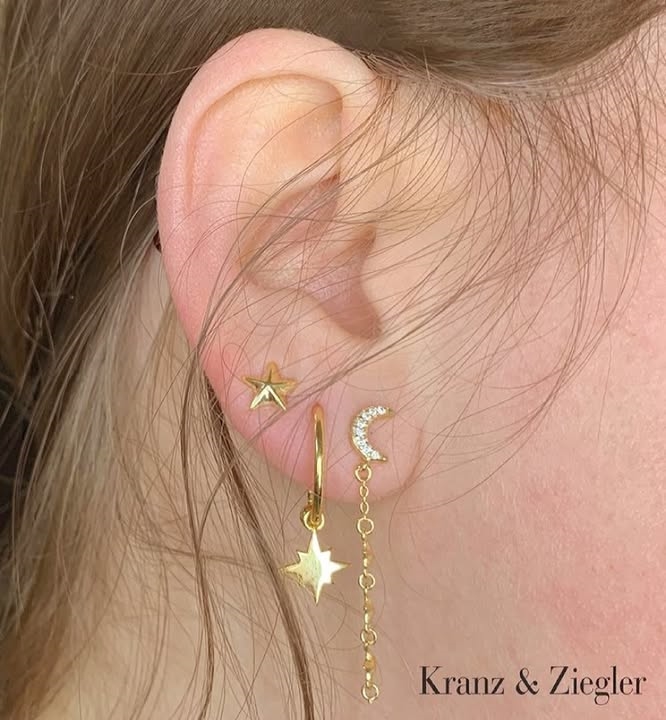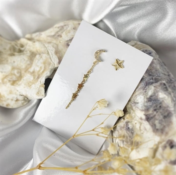 Ein Ohrring ist ein sternförmiger Ohrstecker, der andere ist ein langer Ohrring mit Mond, Sternen und weißen Zirkonia darauf.