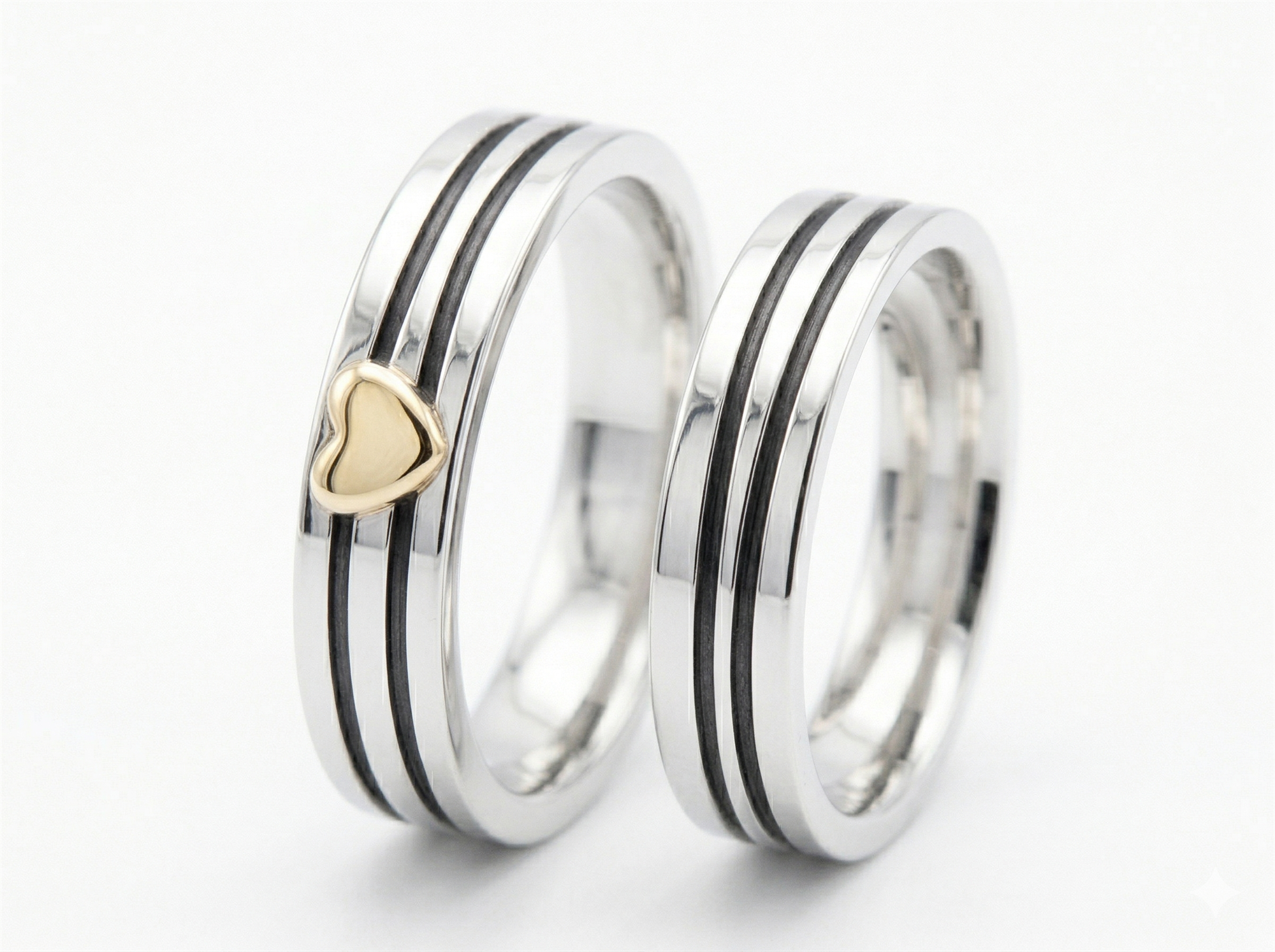Elegantes Trauring-Set von Randers Sølv aus massivem Sterling Silber. Das schräge Muster verleiht den Ringen eine besondere Dynamik, während die polierte Oberfläche für einen edlen Look sorgt. Der Damenring ist mit einem kleinen Herz verziert – ein Symbol für Liebe und Verbundenheit.