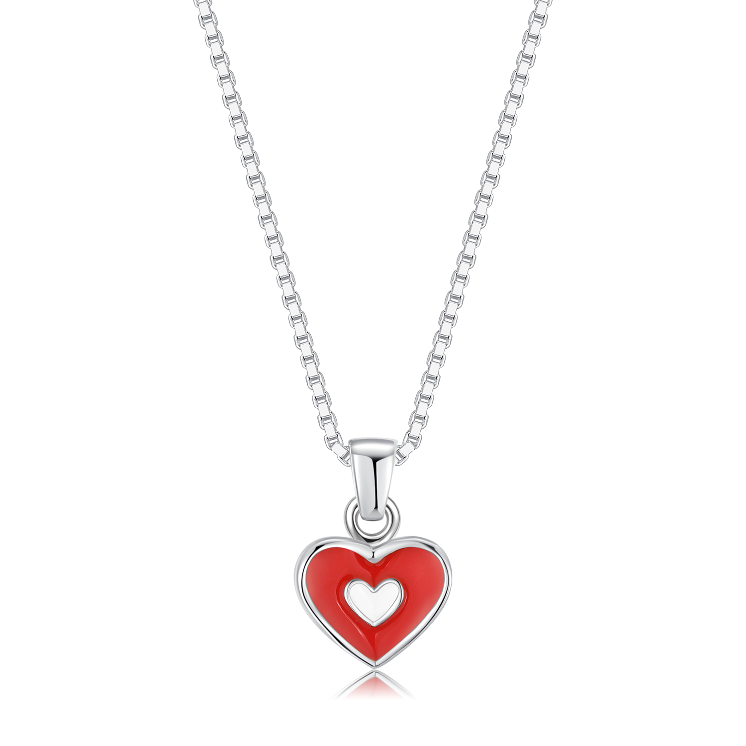 Sølv halskæde rhodineret hjerte i rød med hvid blyfri emalje i midten