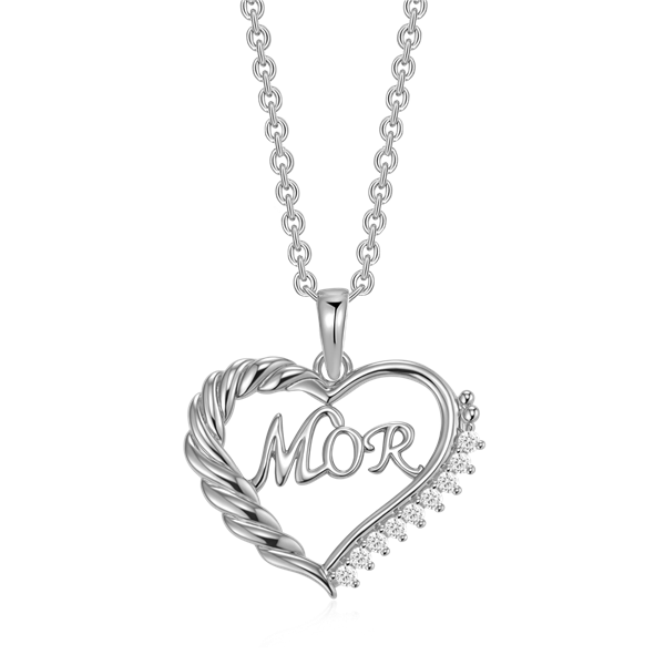 Sølv halskæde rhodineret hjerte med tekst MOR og syntetiske cubic zirconia i den højre side af kant.