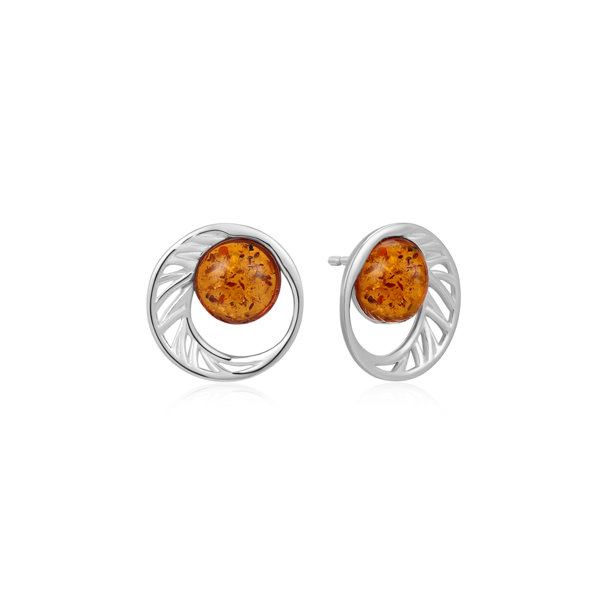 Sølv ørestikker rhodineret cirkel med mønstre og rav i midten.