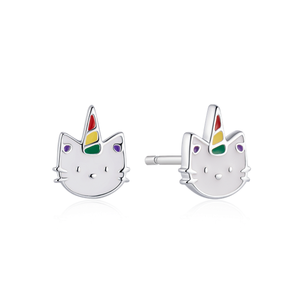 Sølv ørestikker kat hvid hovde med grøn, gul og rød blyfri emalje.
