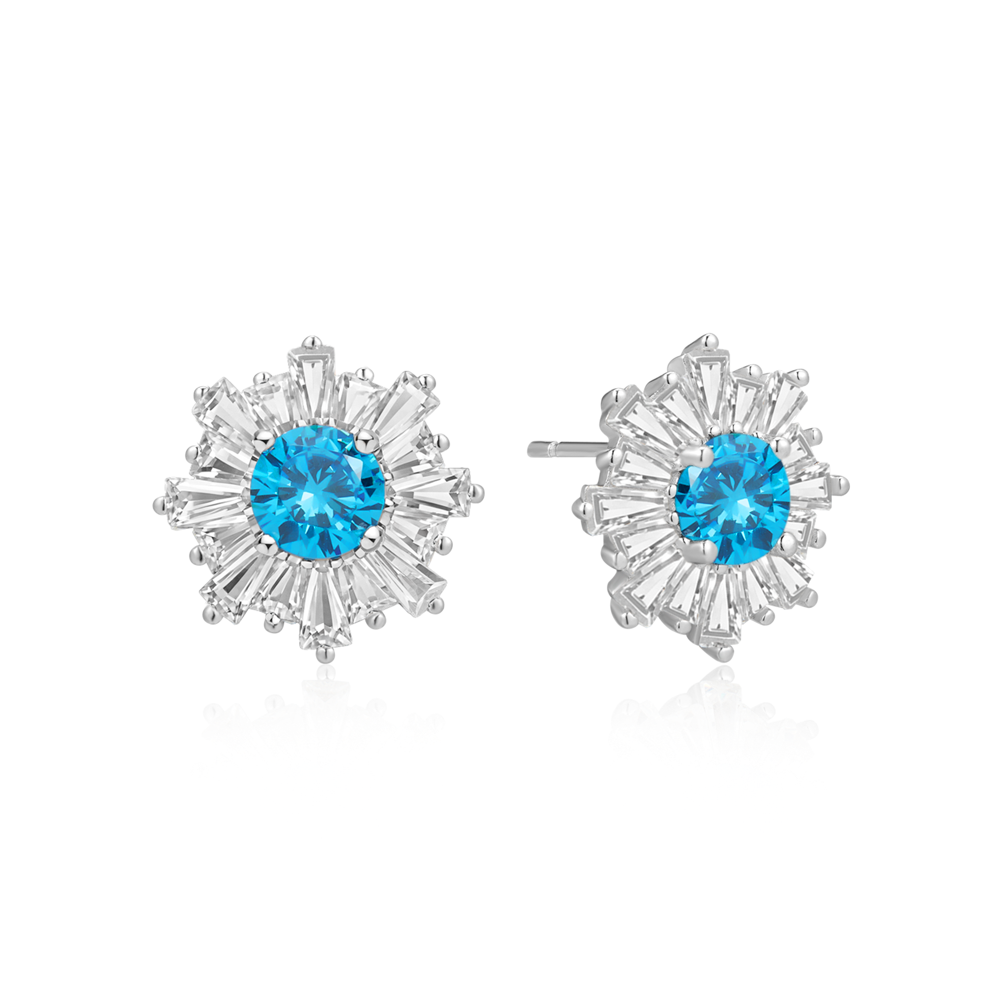Sølv ørestikker rhodineret blomst med syntetiske cubic zirconia rundt om og blå topas i midten.