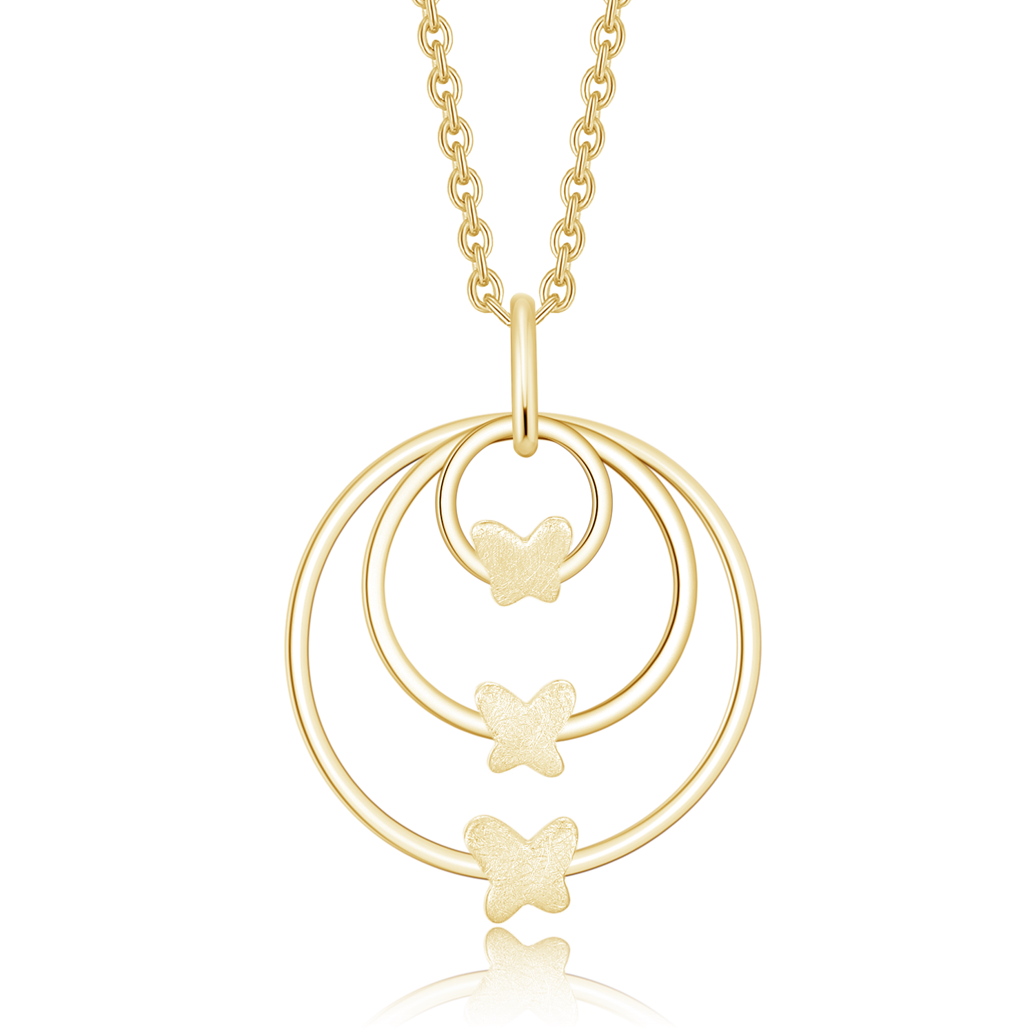 Sølv collier forgyldt 3 cirkler med sommerfugl på hver cirkel samlet i ring
