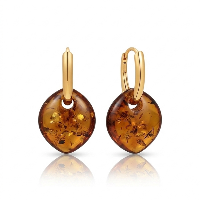 Sølvforgyldt knækcreoler med rav i dråbe form som hænger.