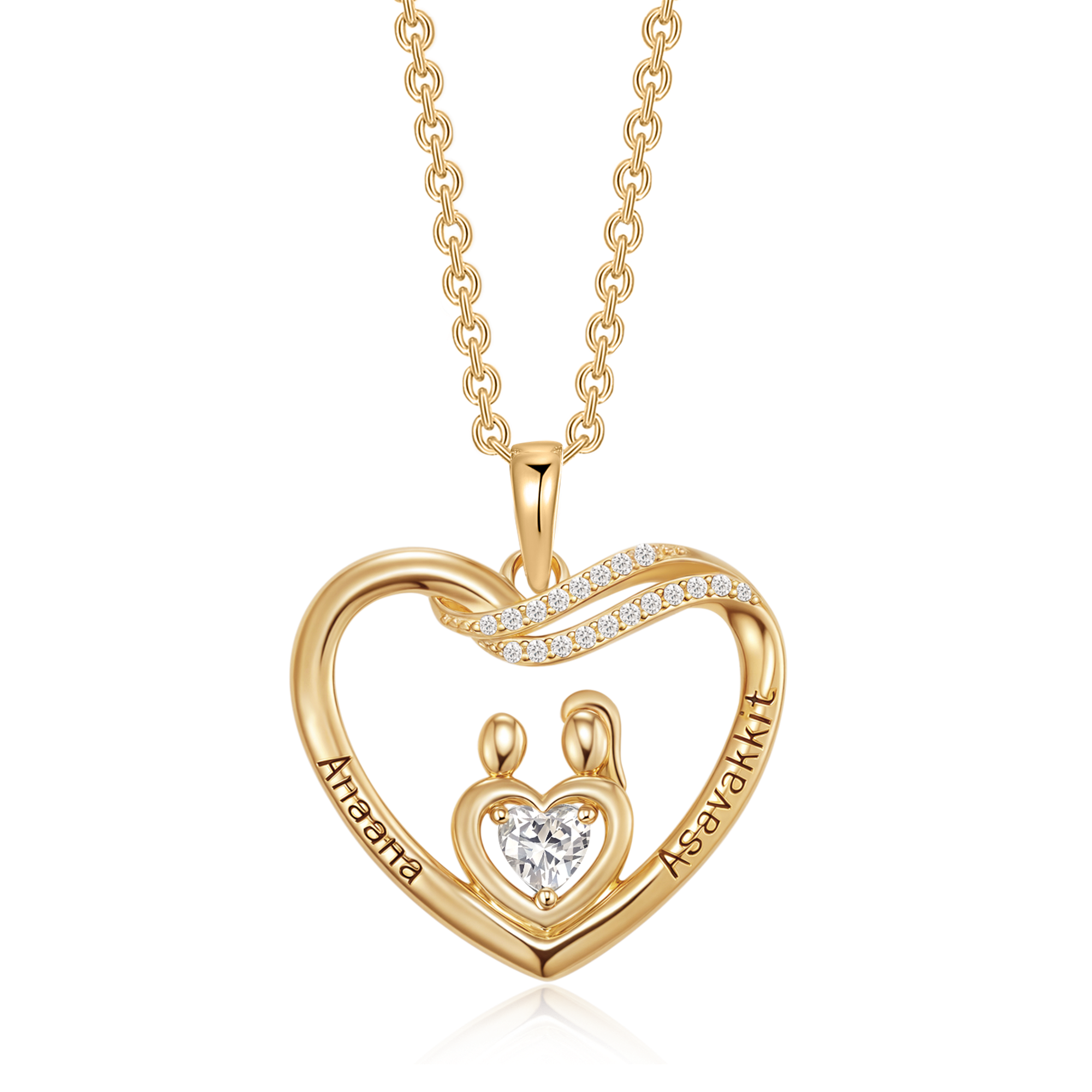 Sølvforgyldt halskæde hjerte med mor og barn med syntetiske cubic zirconia og tekst Anaana i venstre kant og Asavakkit til højre.