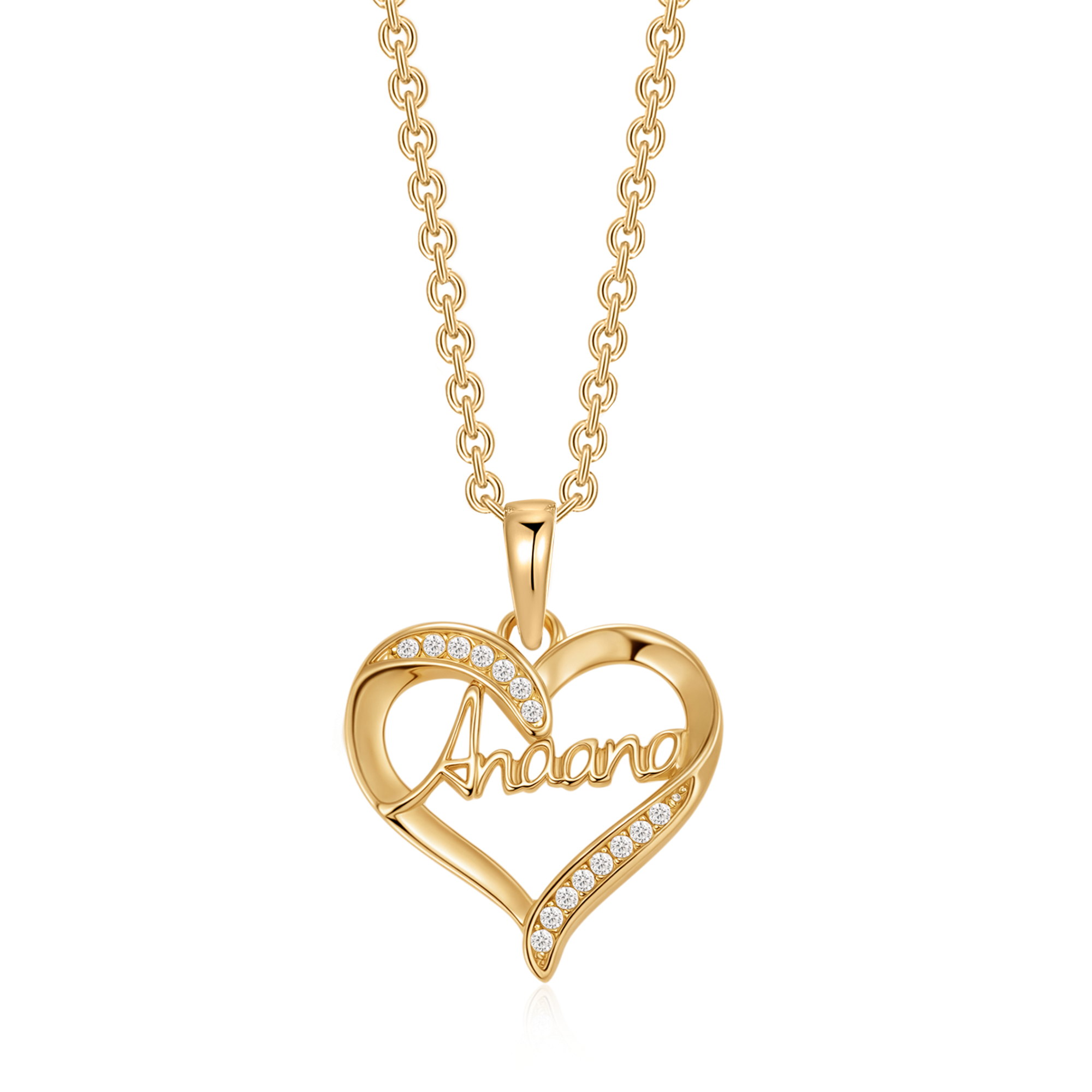 Sølvforgyldt halskæde hjerte med tekst Anaana og syntetiske cubic zirconia i kanten.