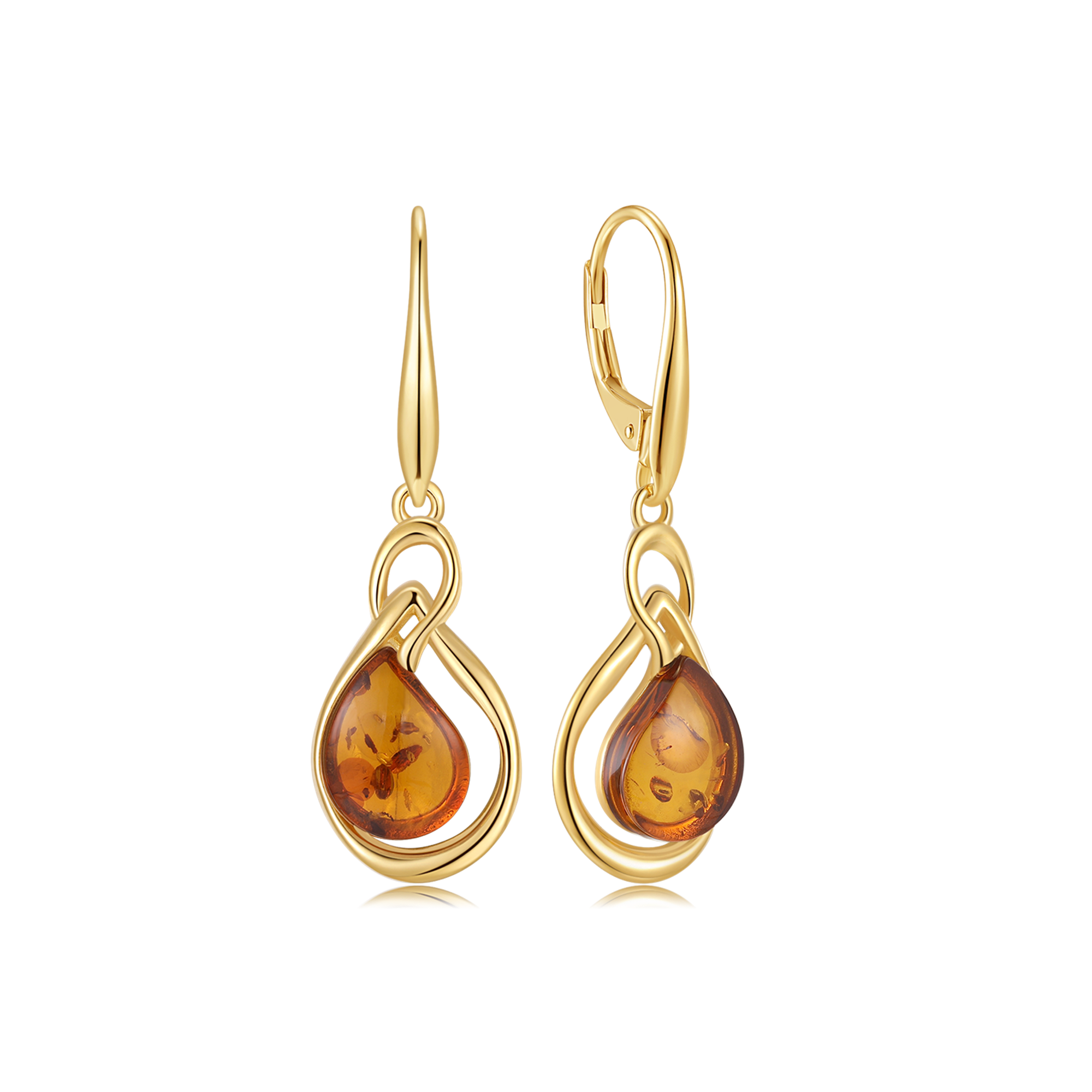Sølvforgyldt ørehængere rav i dråbe form i ring rund om.