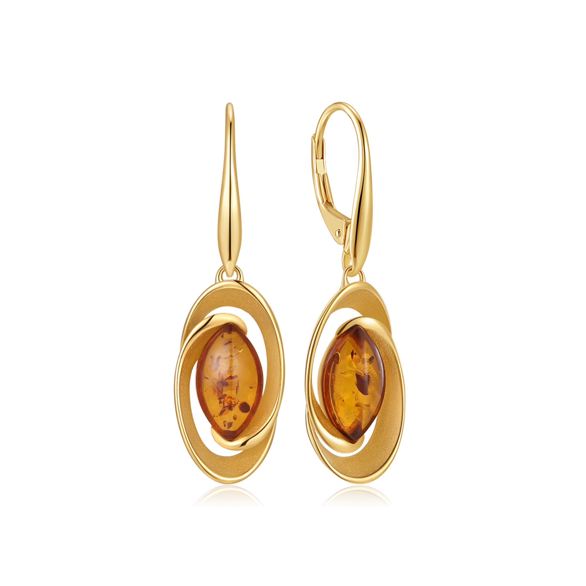 Sølvforgyldt ørehængere flettet oval med rav i midten.