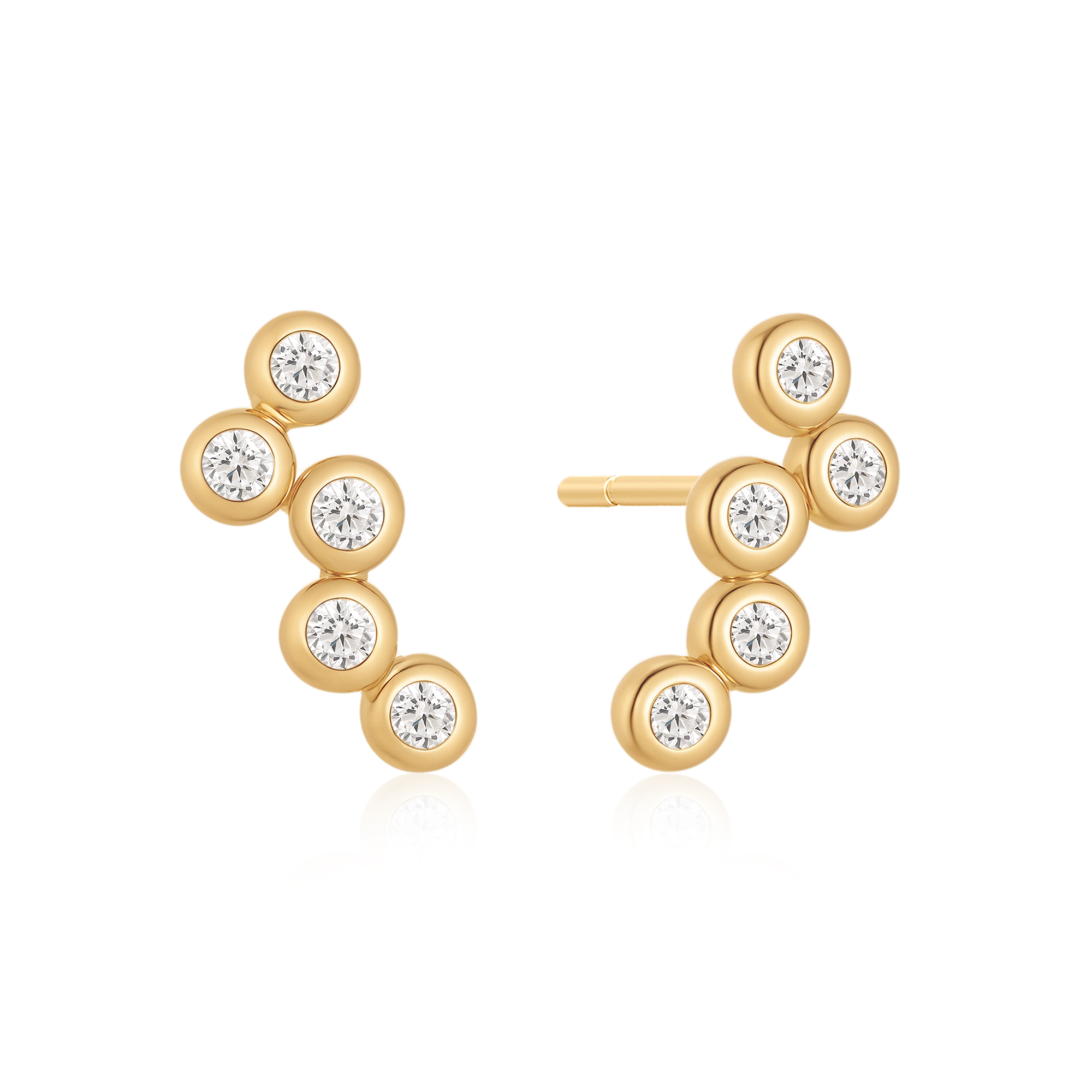 Goldene Ohrringe mit kreisförmigen Elementen und Steinen, in geschwungener Linie angeordnet.