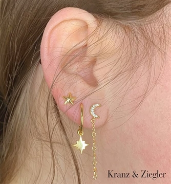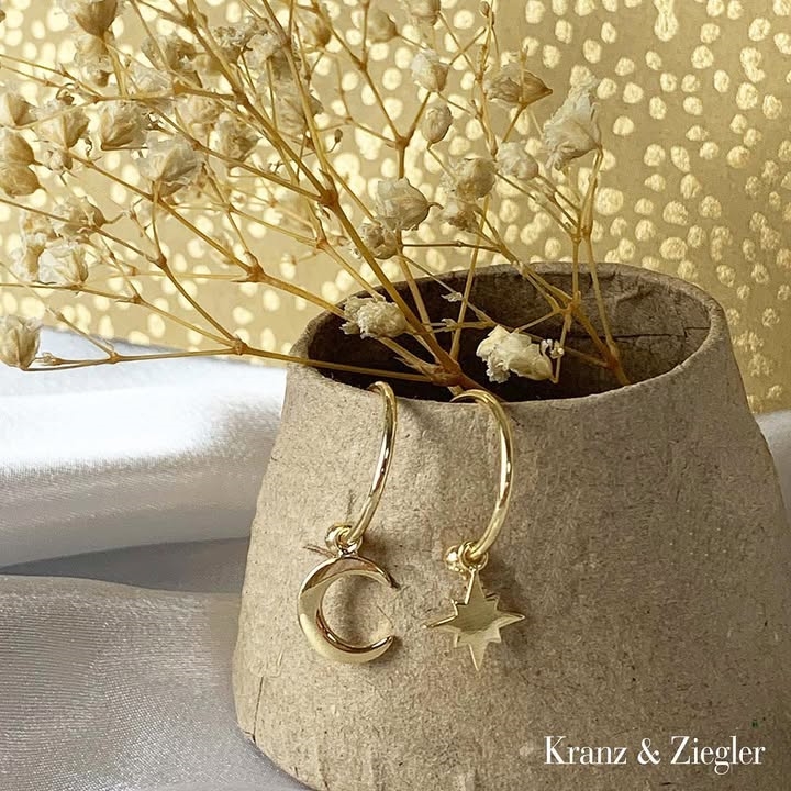 Feine und vergoldete Kreolen in offenem Design mit Anhängern, die einen Halbmond und einen schönen Leitstern darstellen