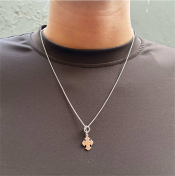 Kreuzanhänger mit Gravuren und Seilschlaufe aus Sterling-Silber, zentrale Figur im Kreuz.