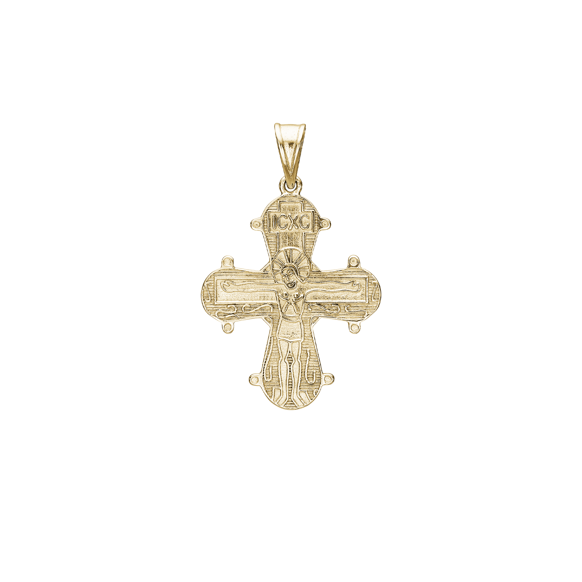 Detailliertes Kreuz mit zentraler Figur, Aufhängeschlaufe und Text am oberen Ende.