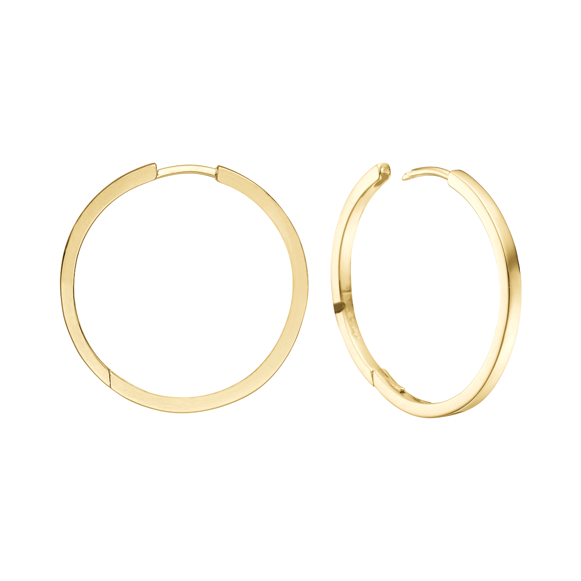 Goldene, runde Ohrringe mit glänzendem Finish und Klappverschluss, 26mm Durchmesser, 1,9mm dick.