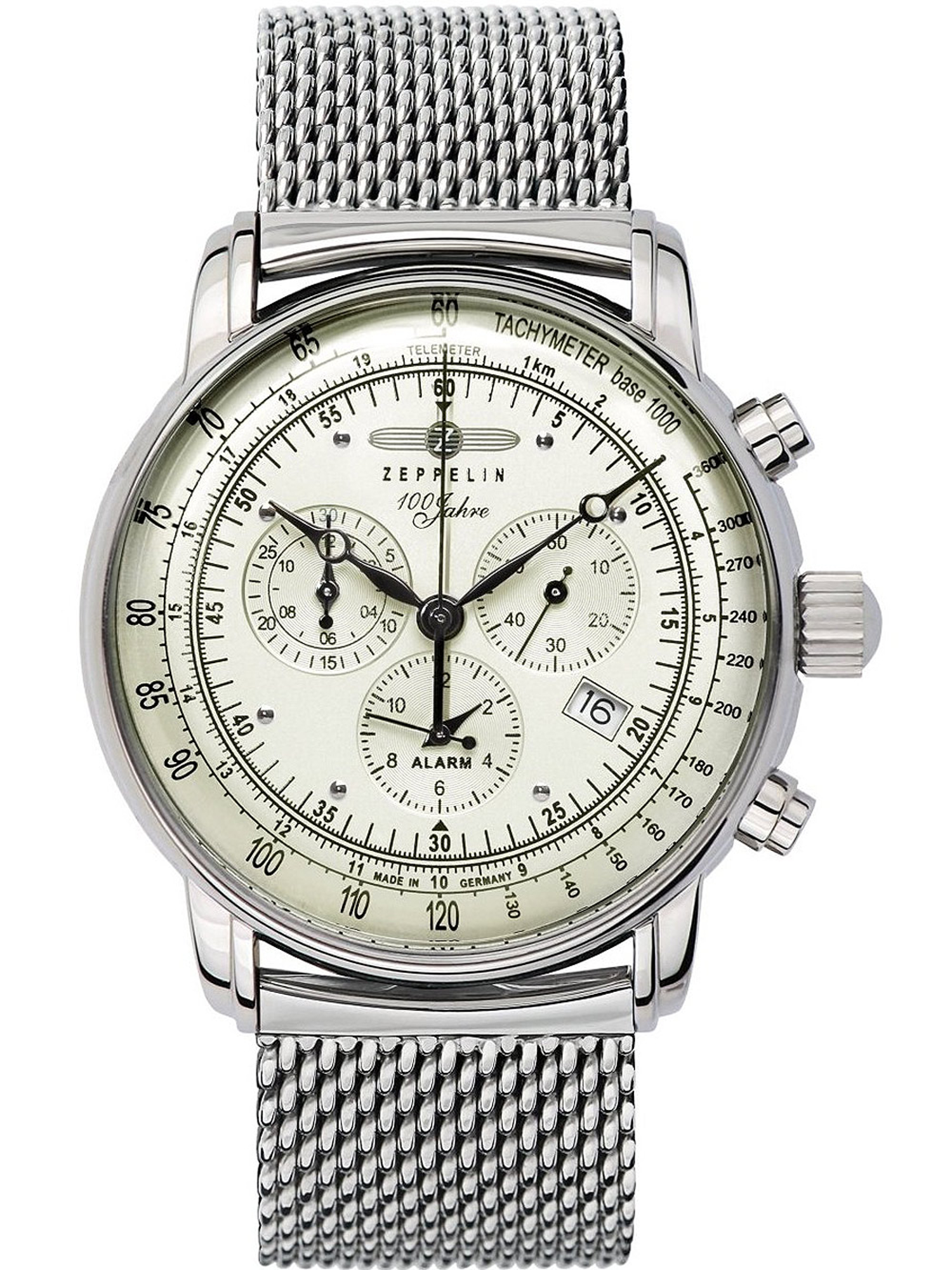 Zeppelin 8680M-3 Alarm Chronograph 100 Years Mens Watch 43mm 5ATM Wristwatch